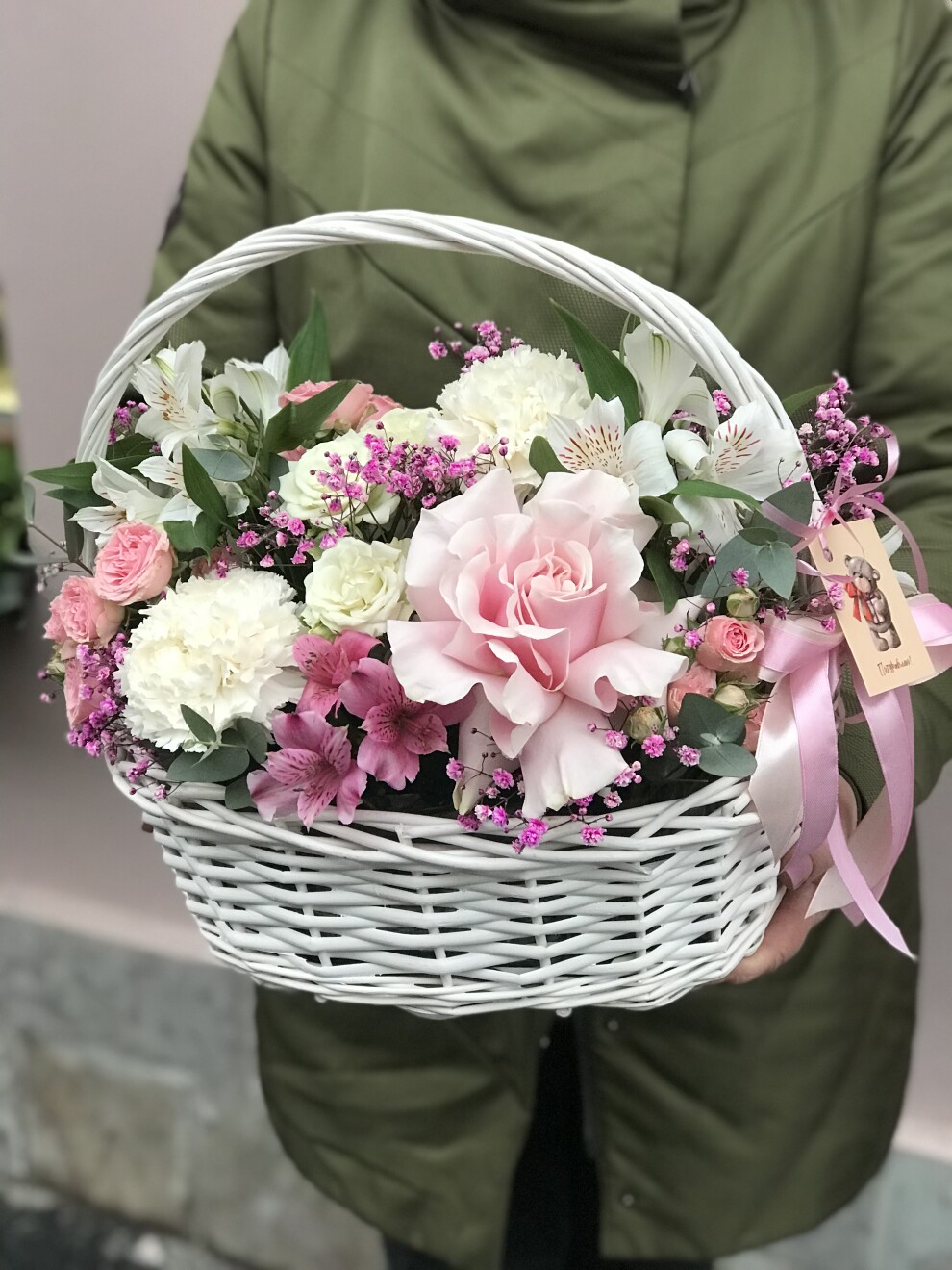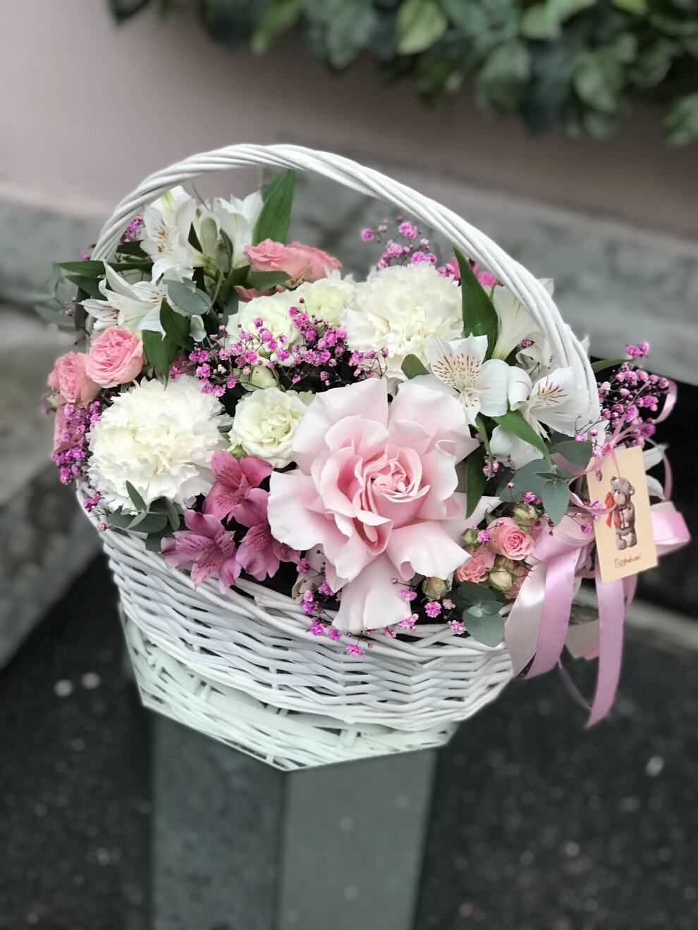 Французские розы 1 шт, гипсофила 3 шт, кустовая роза 4 шт, гвоздика 2 шт, альстромерия 3 шт, корзина 1 шт.
