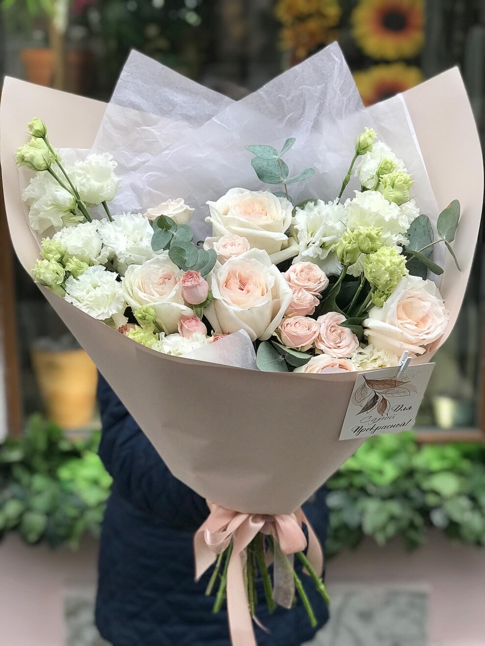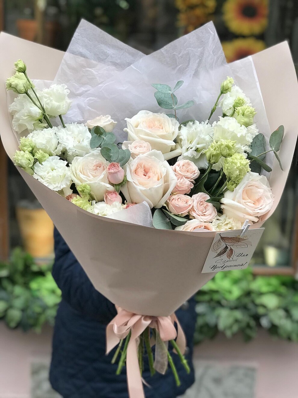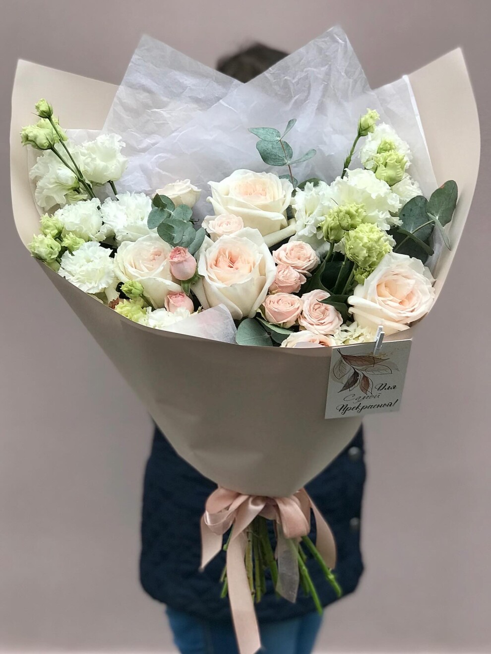 Пионовидная роза 5 шт, кустовая Роза 3 шт, лизиантус 5 шт, эвкалипт ,упаковка, ленты, тишью. Длина 40-45 см.