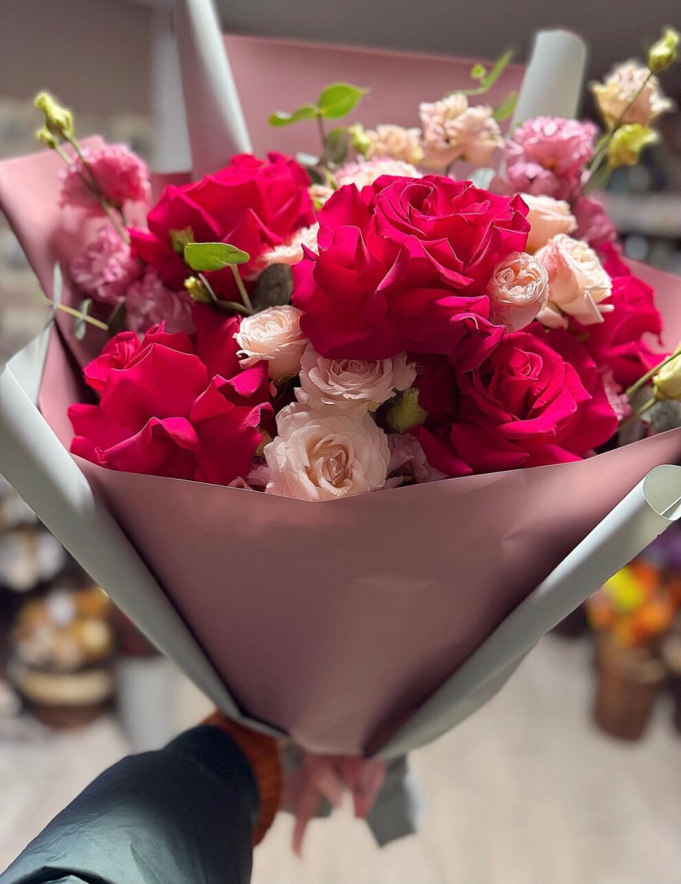 Французские розы 5 шт, эвкалипт , кустовая пионовидная Роза 3 шт, лизиантус 5 шт, упаковка, ленты . Высота 45-50 см