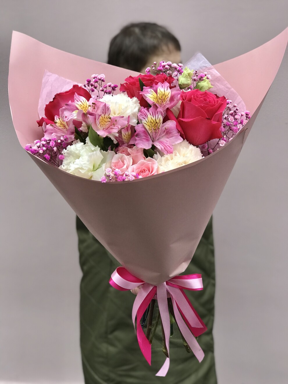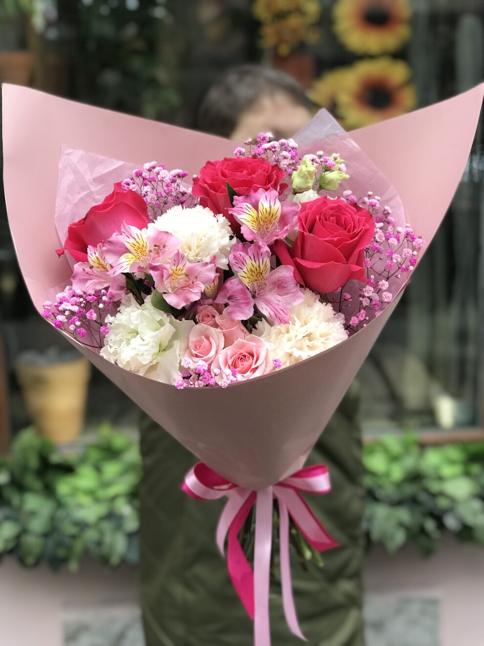 Одноголовая роза 3 шт, лизиантус 1 шт, кустовая роза 1 шт, гвоздика 2 шт, альстромерия 2 шт, гипсофила 1 шт, упаковка.