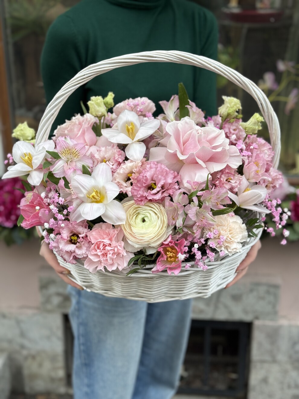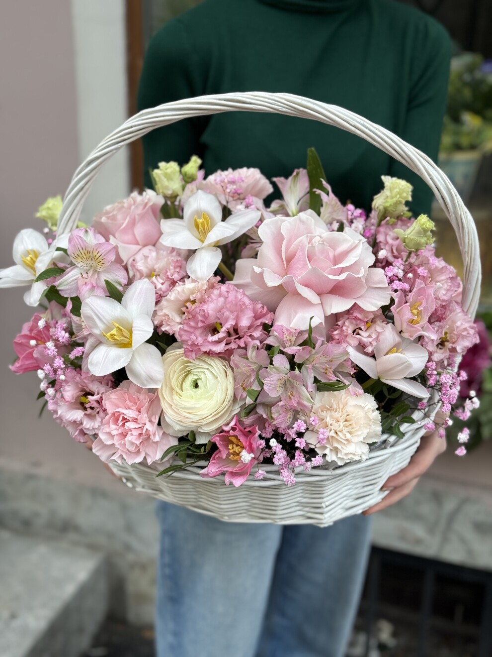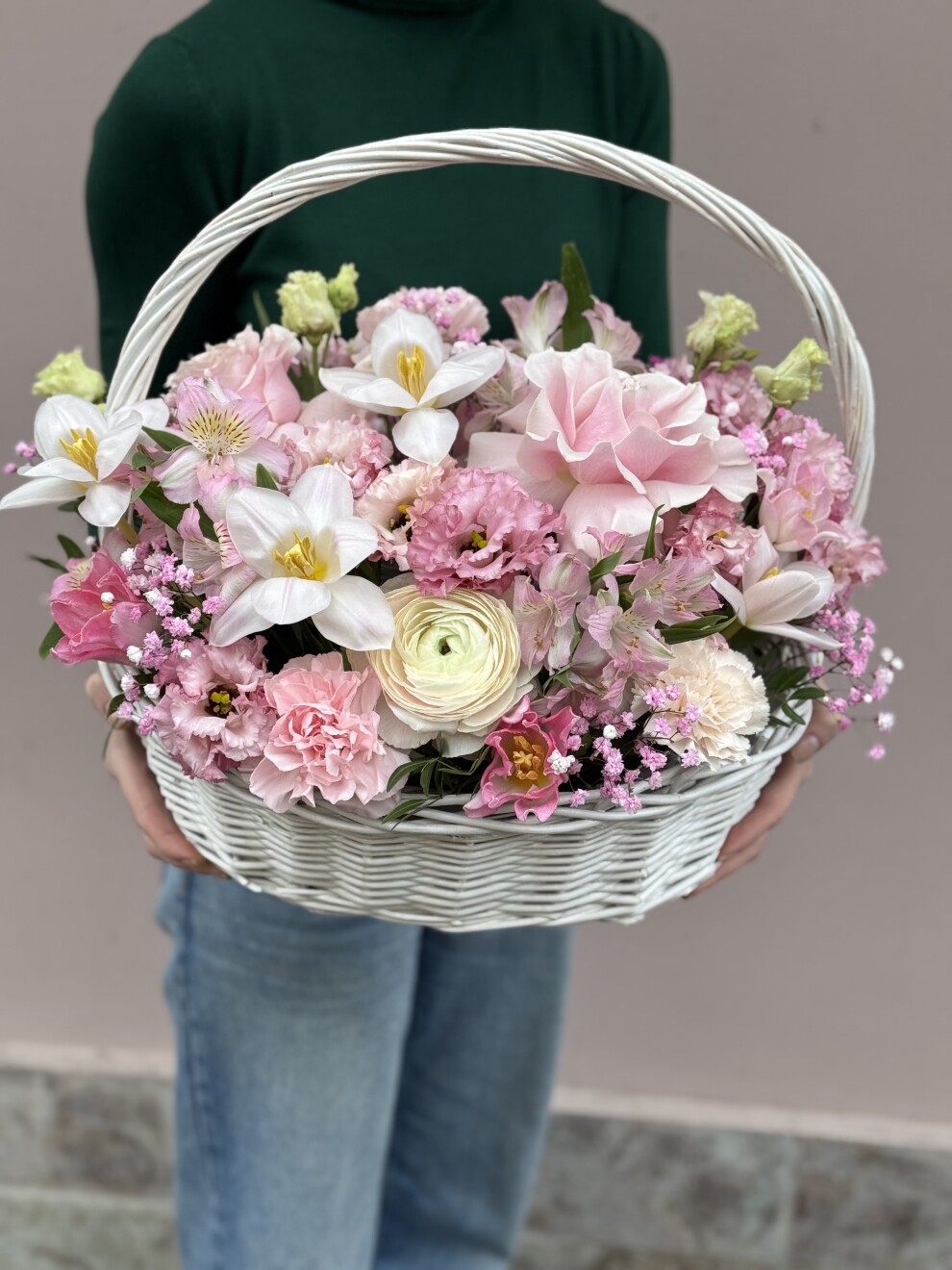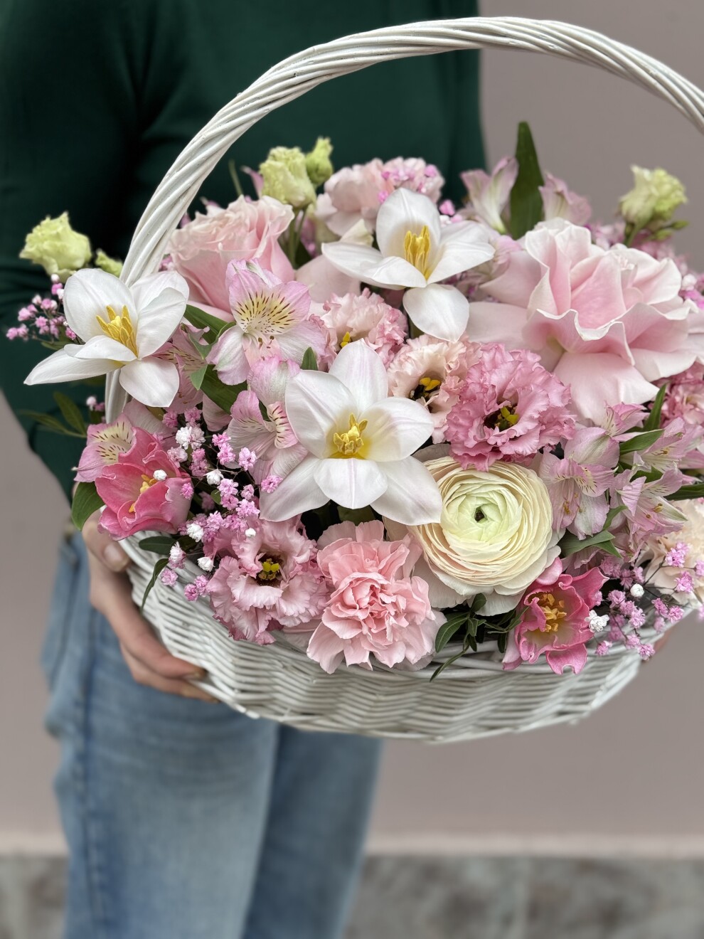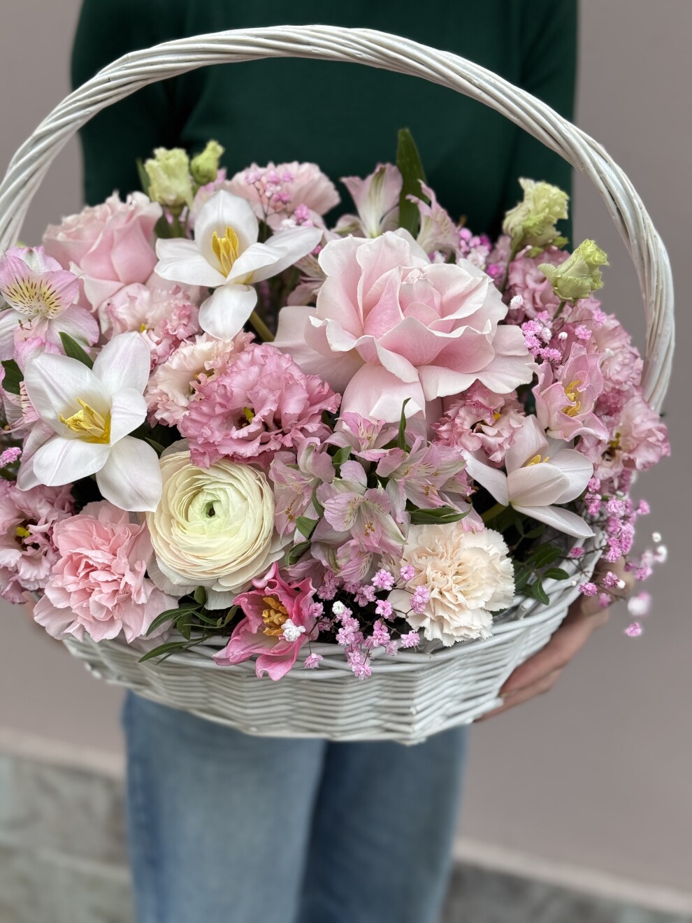 Одноголовая роза 5 шт, тюльпан 5 шт, эвкалипт 10 шт, лизиантус 7 шт , гипсофила 3 шт, альстромерия 5 шт , кустовая роза 5 шт, корзина.