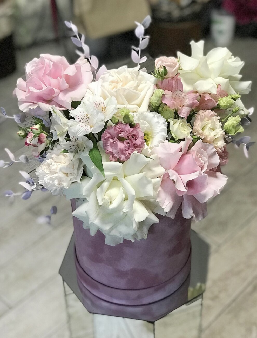 Французские розы 4 шт, Садовая Роза 1 шт, лизиантус 3 шт, эвкалипт, гвоздика 3 шт, Роза кустовая 1 шт, альстромерия 2 шт.