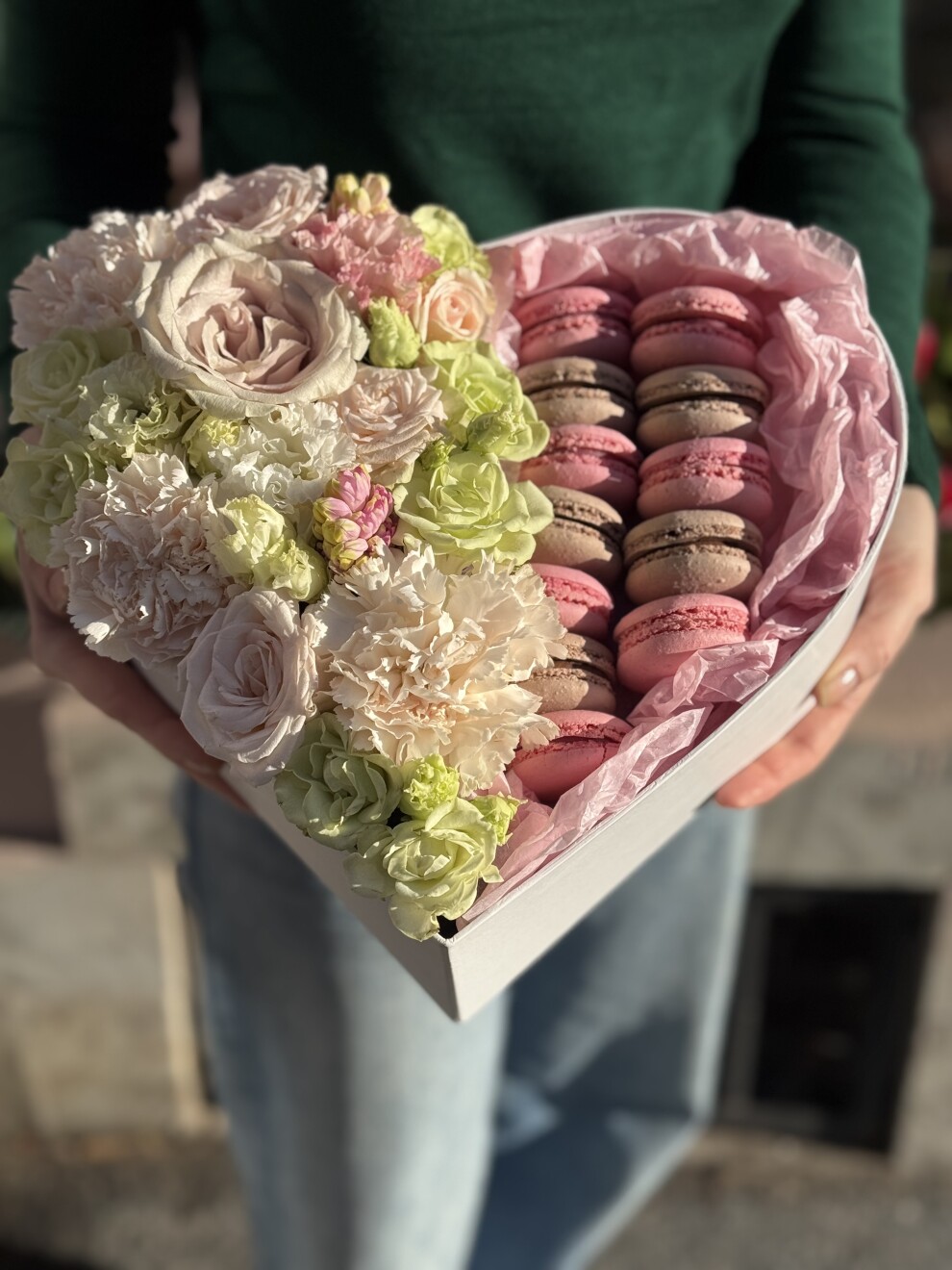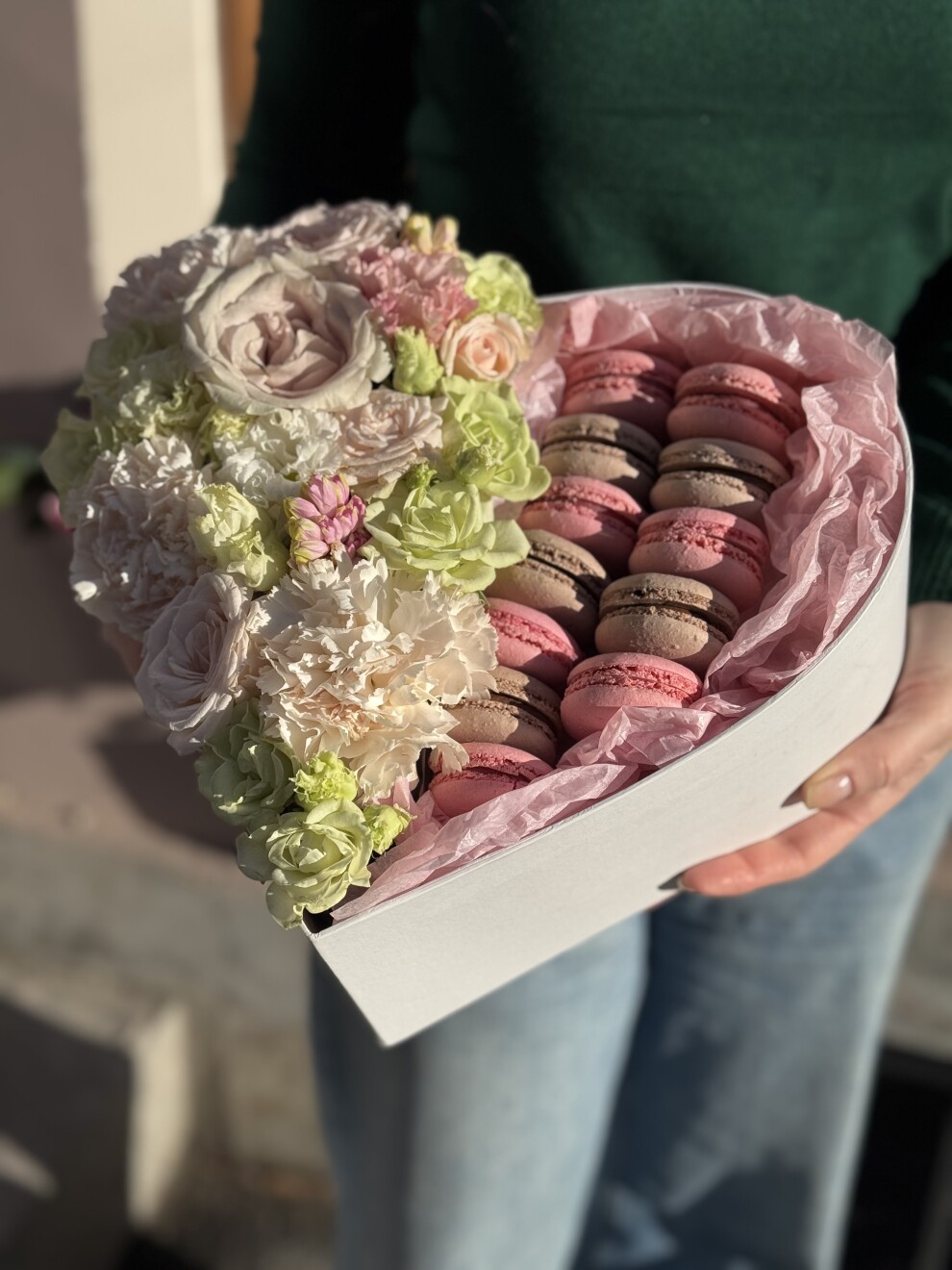 Макруны, гвоздика, роза, лагурус.