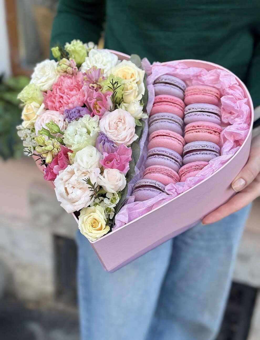 Коробочка, макруны, цветы