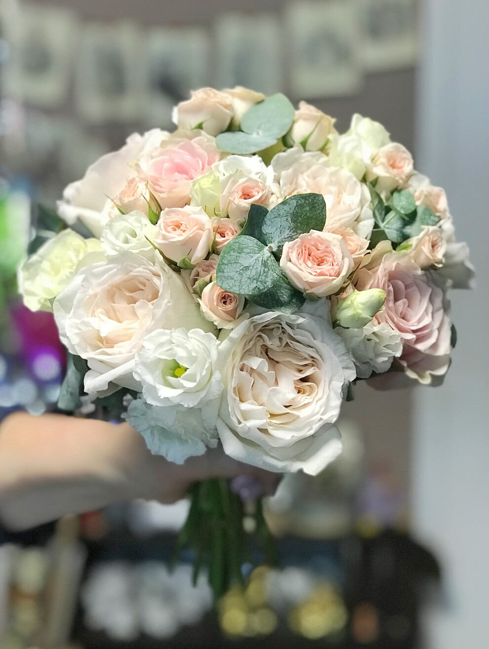Пионовидная Роза 3 шт, одноголовая роза 5 шт, кустовая роза 5 шт, лизиантус 2 шт, эвкалипт, ленты.