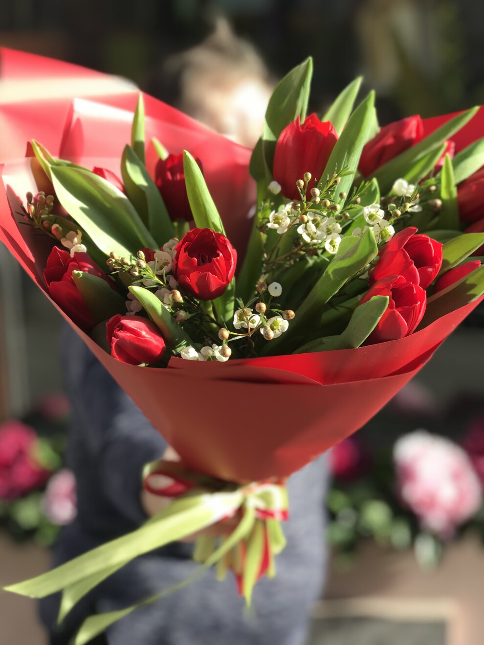 Тюльпаны 15 штук , хамелациум 2 шт, упаковка.